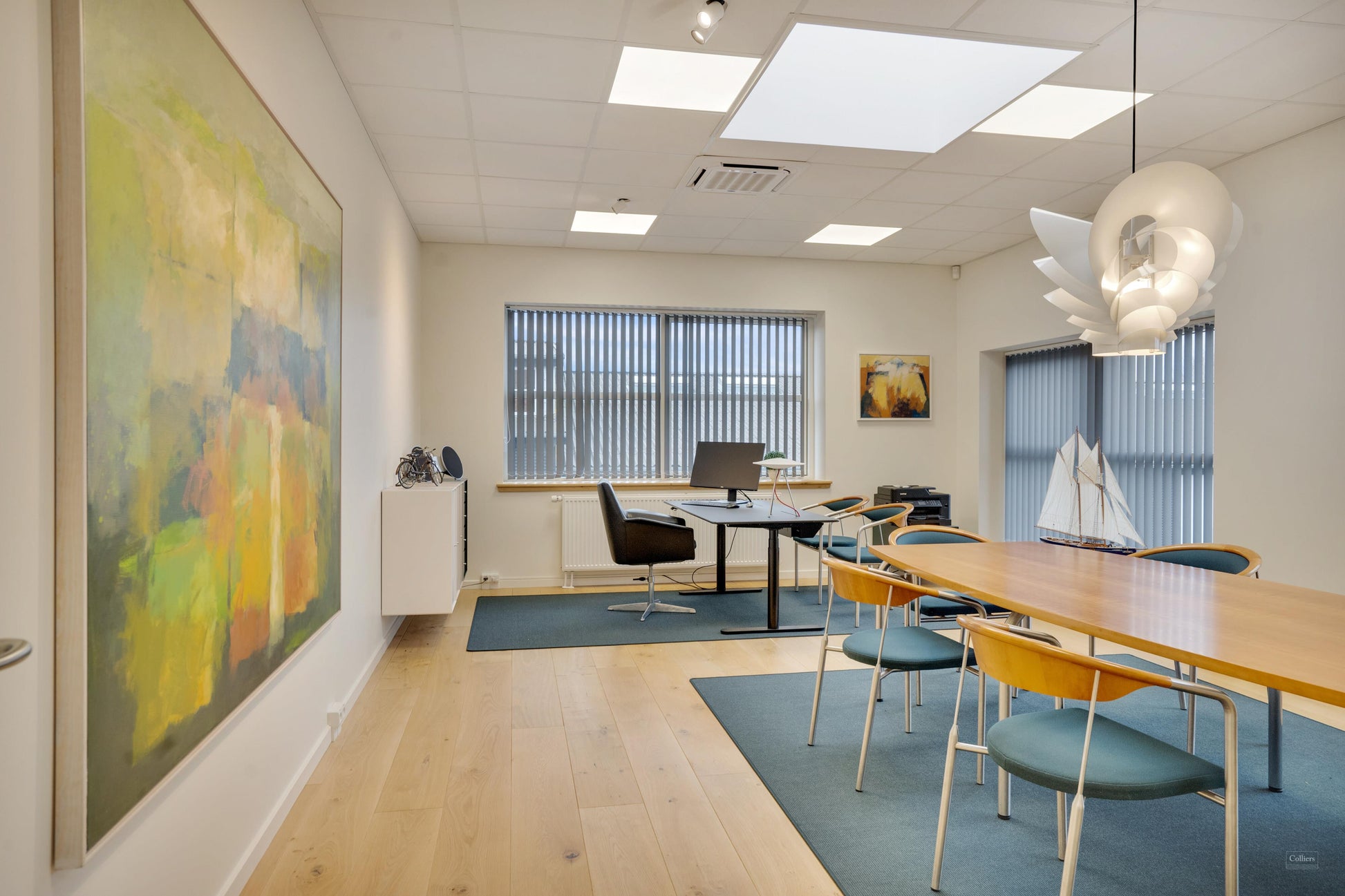 Lejemålet består af ét stort kontor, med hvide vægge og lyst trægulv. Derudover har man som lejer også adgang til fælles køkken- samt toiletfaciliteter.