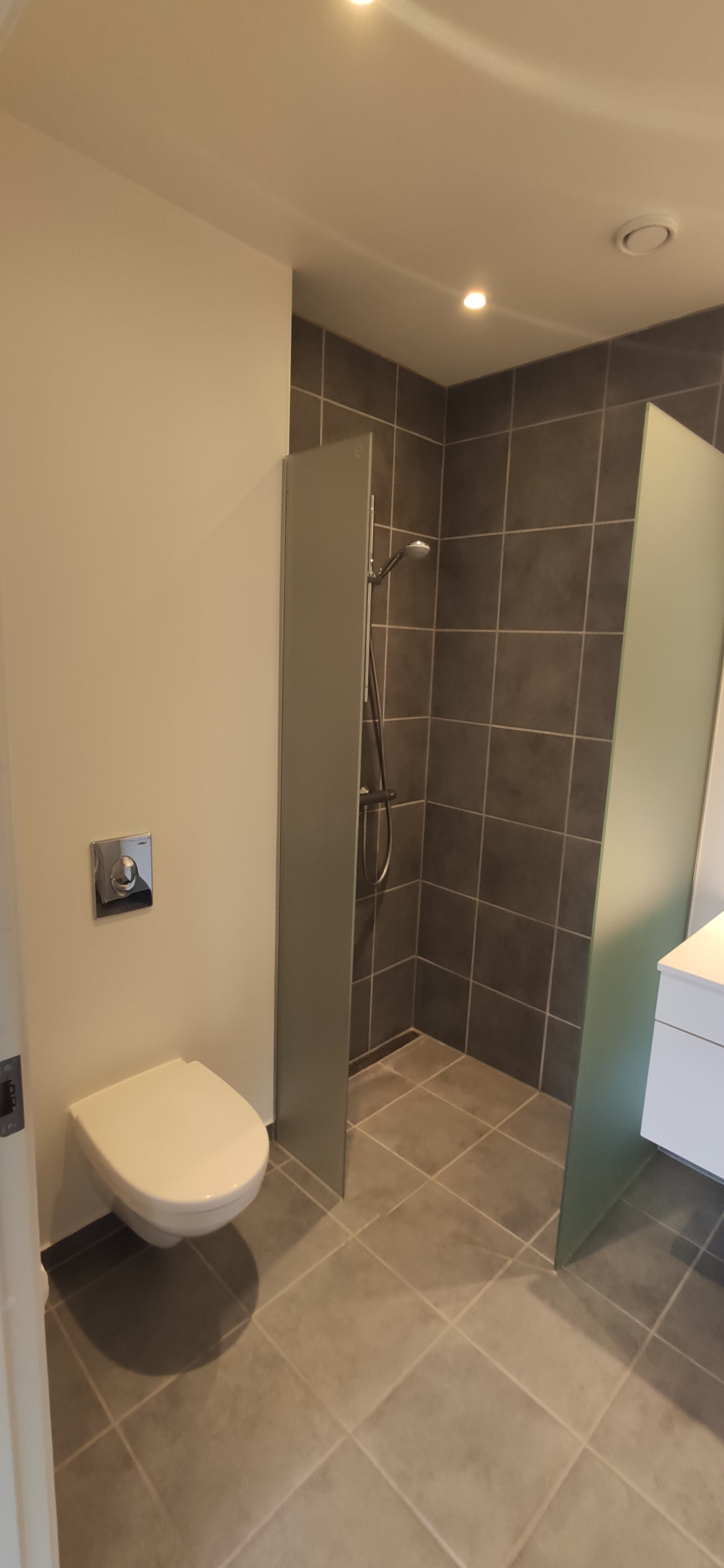 Entre med garderobe, badeværelse med bruser, og begge rum har grå fliser og varme i gulvet. Der er både vaskemaskine og tørretumbler i lejligheden.